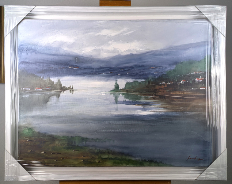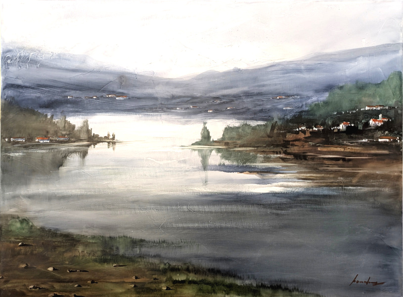 Tela de linho montada em grade de caixa alta 4cm, com a pintura a prolongar-se para as laterais.