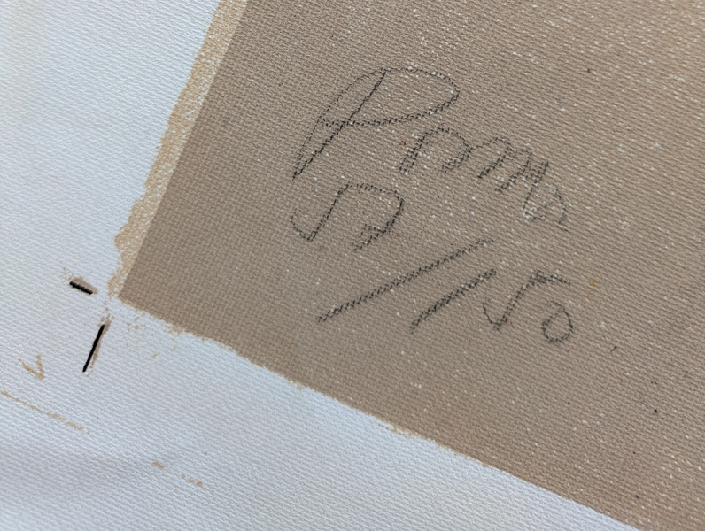 Imagem de pormenor da área de assinatura e numeração onde se pode observar o rebordo e as guias da impressão serigráfica. Estas guias serão ocultadas no emolduramento.