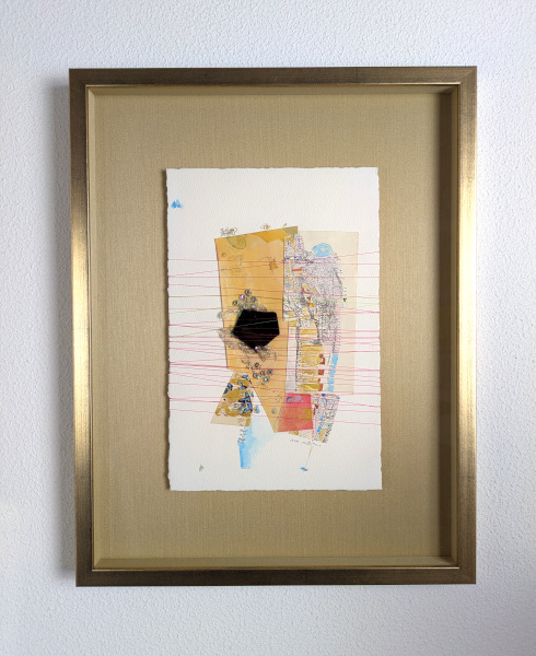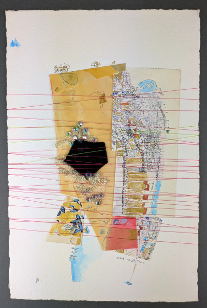 Pintura, colagem de papéis, tecidos e lantejoulas e linhas sobre papel de algodão.